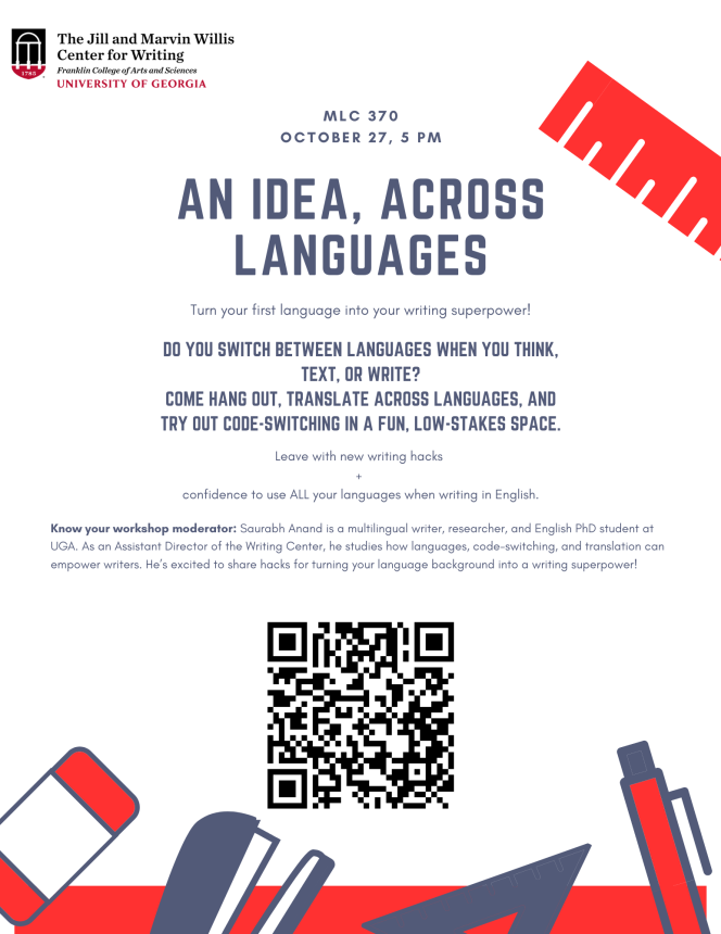 An Idea, Across Languages workshop invites writers to use their first languages as tools for brainstorming, reflection, and translation while writing in English. Through guided activities, participants will explore how meaning shifts across languages and cultures, gaining strategies to strengthen academic writing.